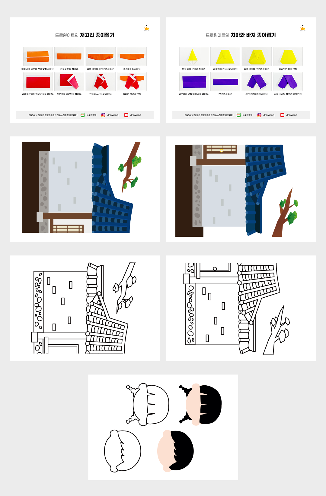 드로윈아트에서 준비한 한복 종이접기를 더해 멋진 작품을 완성해 보세요. 설날이나 추석에도 즐겁게 활용할 수 있는 미술놀이랍니다. 다음에는 또 새로운 재미있는 활동으로 만나요.