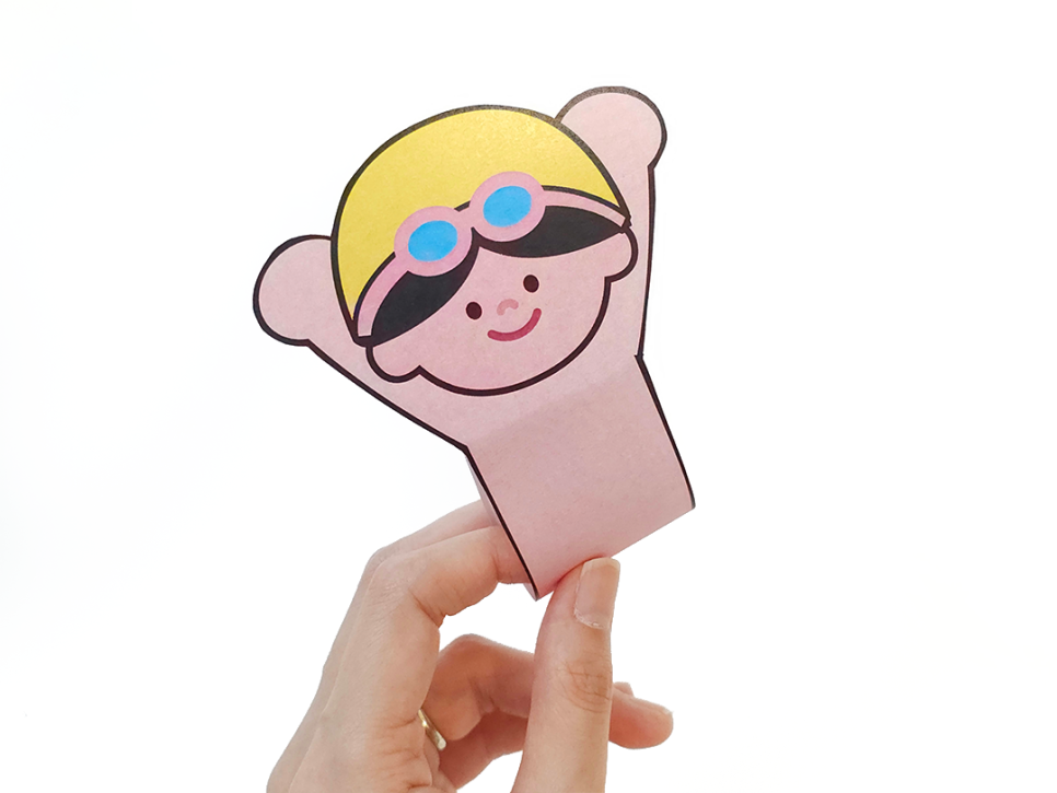 수영 모자와 안경을 쓴 아이는 아래를 둥글게 말아서 입체적으로 고정해요.