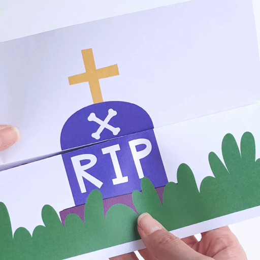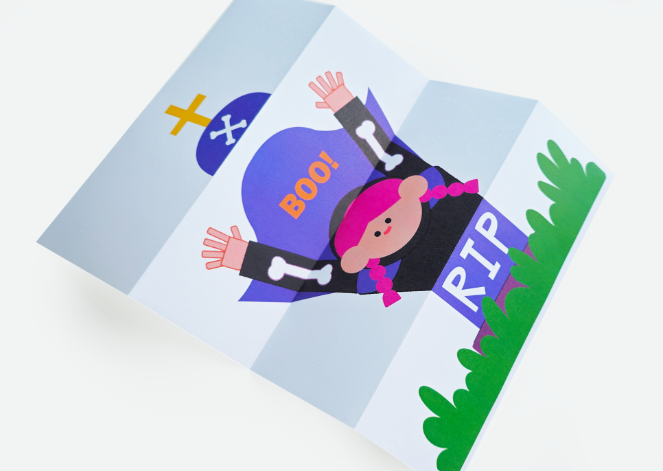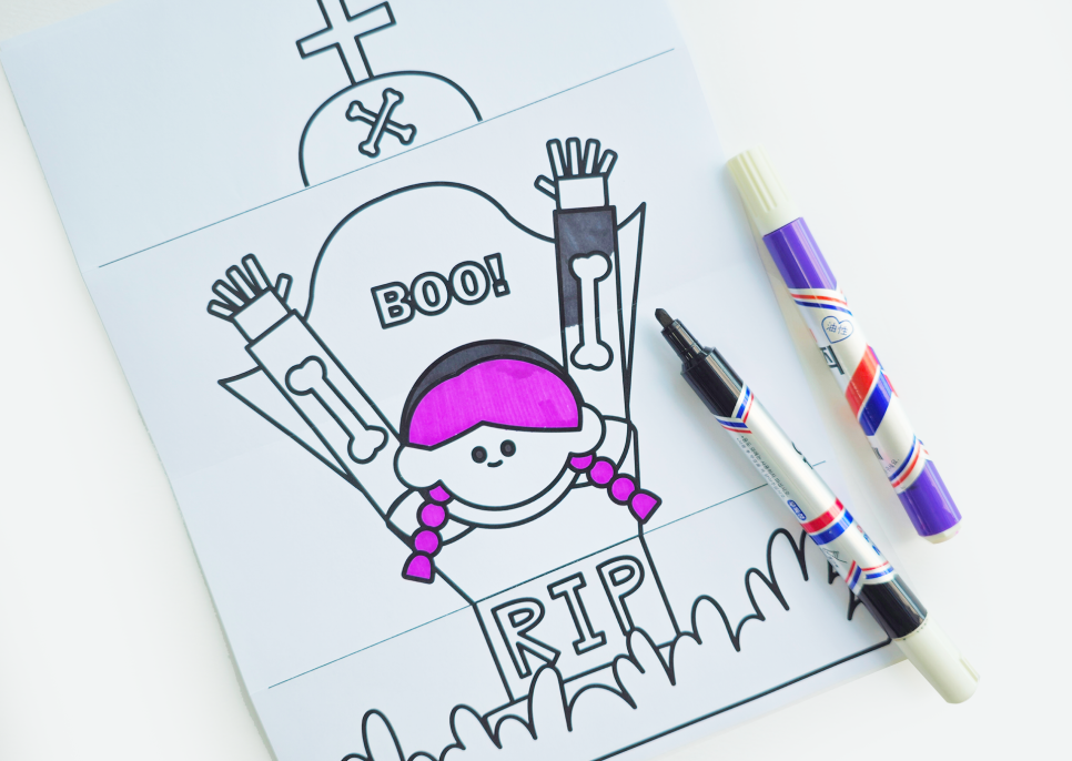 이제 가장 재미있는 순간! 무덤을 열면 깜짝 놀랄 귀여운 드라큘라 코스튬을 입은 아이가 등장해요. 아이가 그림 속 캐릭터를 상상하며 그리면서 더욱 재미있어할 거예요.