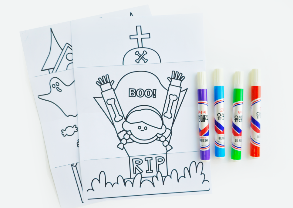 준비물은 도안과 색칠 도구인 사인펜, 마커 등만 있으면 충분해요. 아이와 함께 즐거운 할로윈 그림을 완성해보세요.