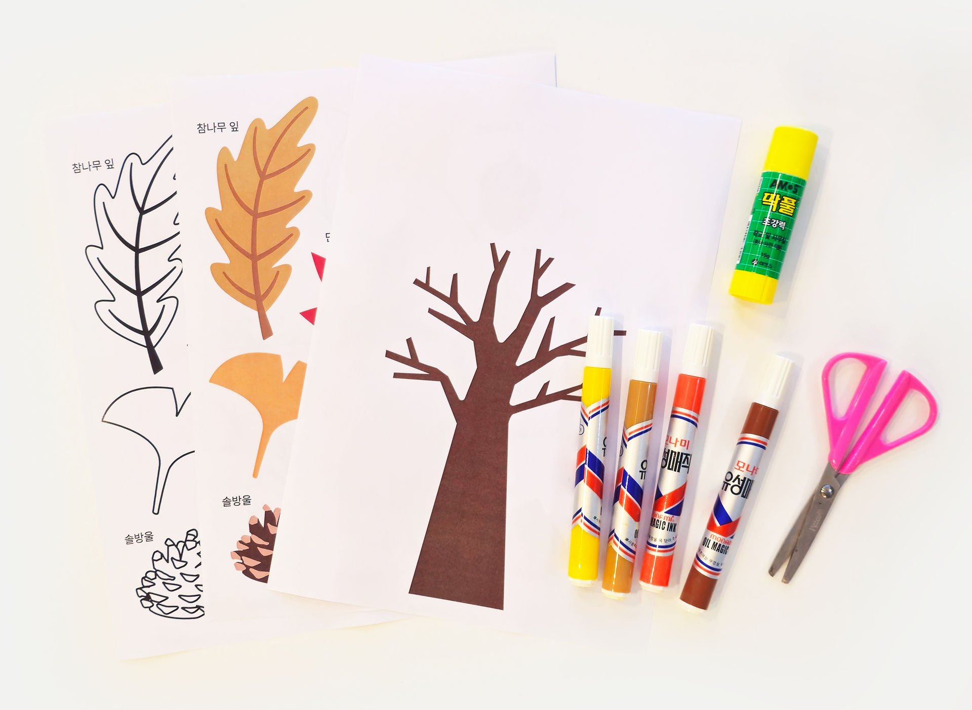 준비물은 낙엽 도안, 가위, 사인펜, 풀이에요.