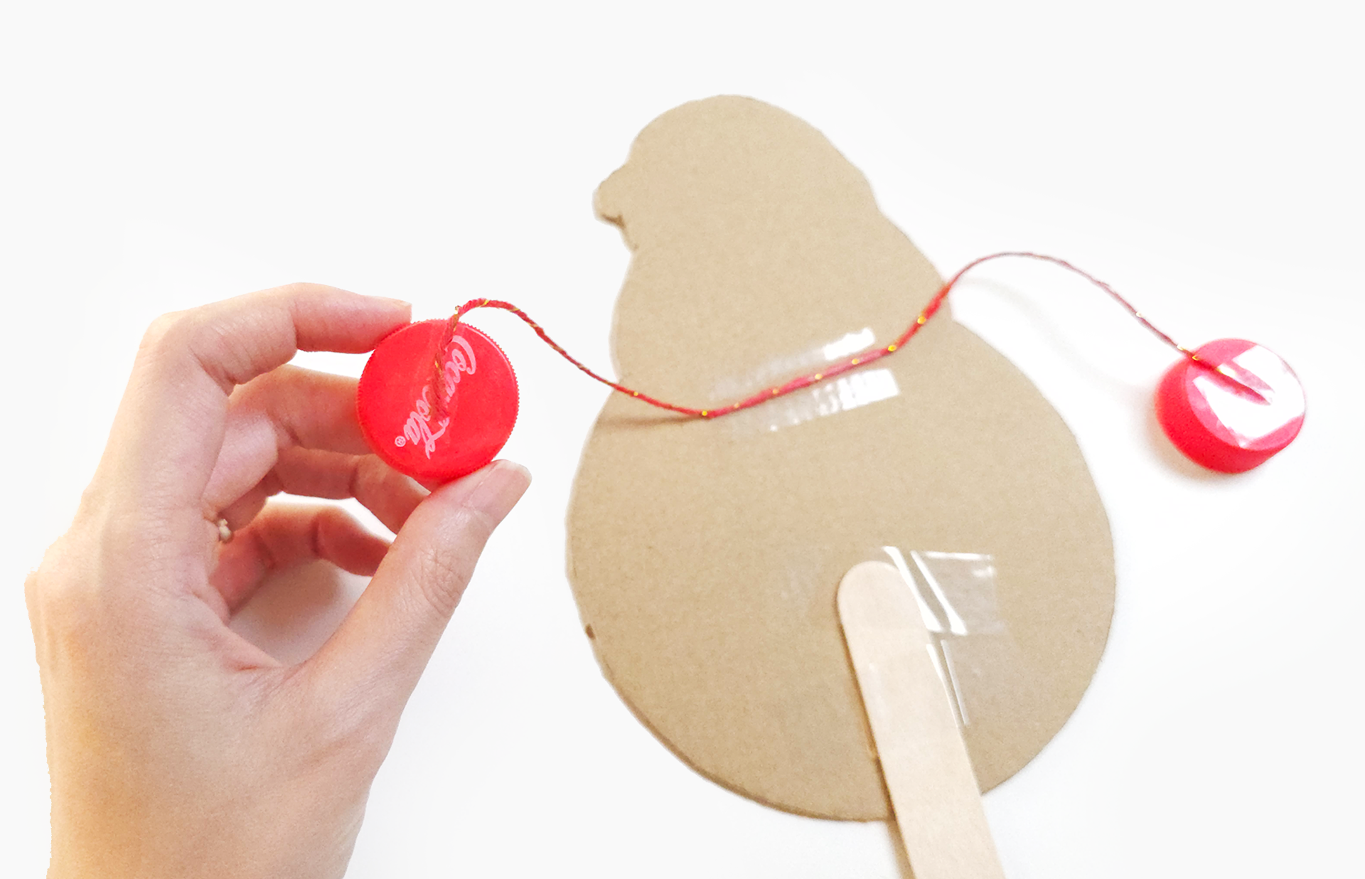 실의 양끝에 병뚜껑을 붙여 주세요. 이렇게 하면 딸랑이에서 나는 소리가 더 잘 들려요!