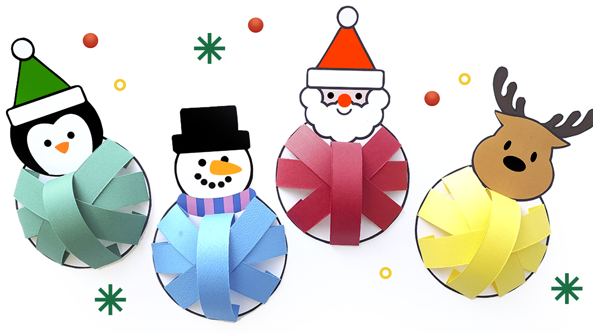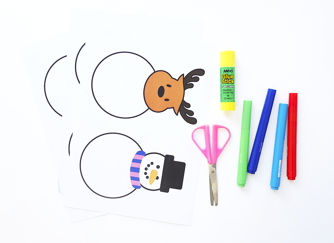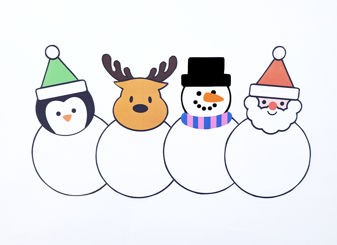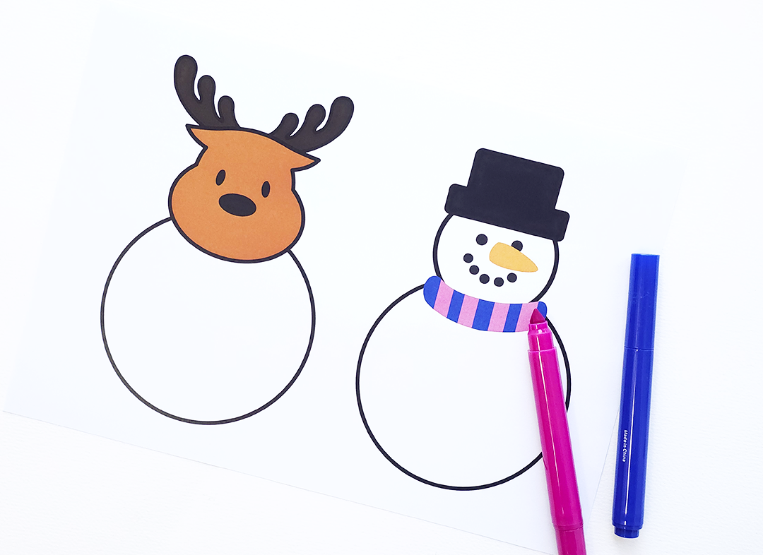 아이가 도안을 색칠하며 루돌프, 펭귄, 산타, 눈사람의 얼굴을 자유롭게 꾸밀 수 있어요.