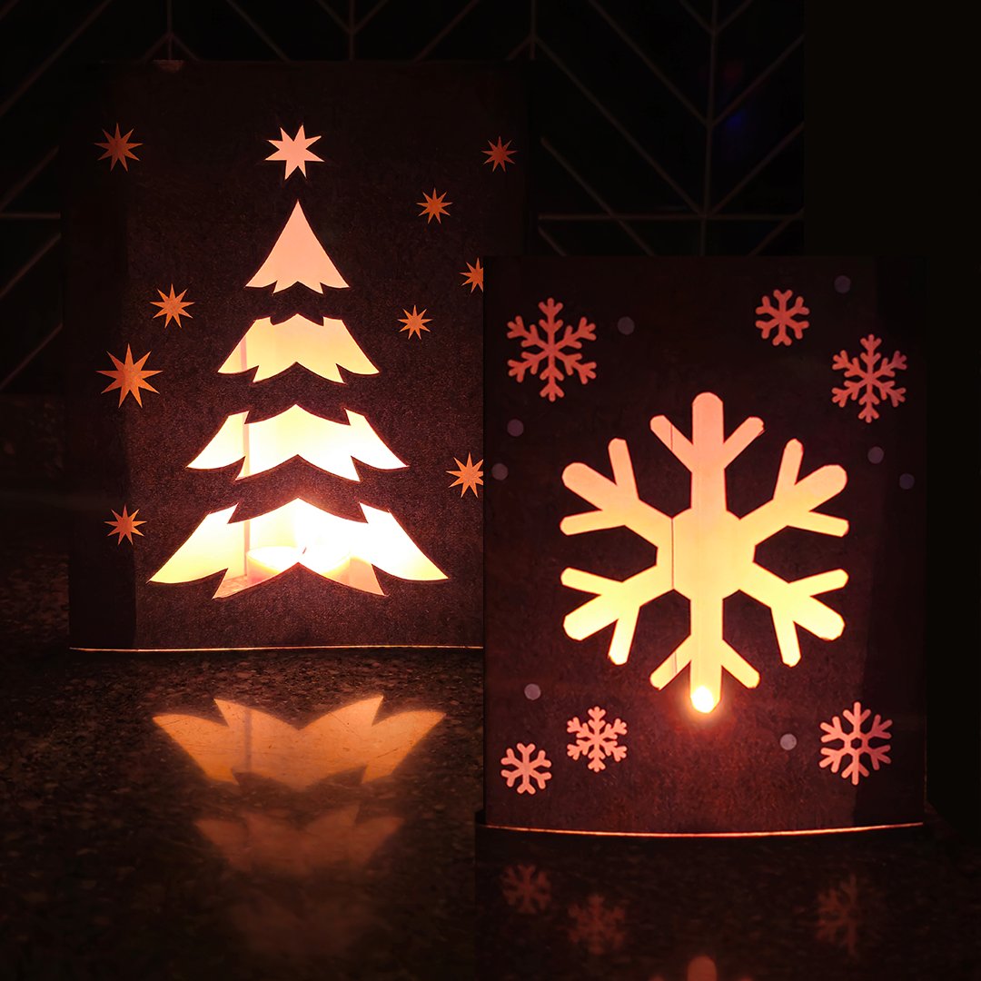 완성된 도안은 이어 붙여 삼각 기둥 모양으로 만들어요. 형태가 세워지는 과정을 보며 입체에 대한 감각도 함께 키울 수 있답니다. 마지막으로 가운데에 초를 넣으면 은은한 크리스마스 조명이 완성돼요. 공간을 부드럽게 밝혀 주는 무드등으로 연출하면 아이가 직접 만든 작품이 생활 속에서 사용되는 즐거움도 느낄 수 있어요.