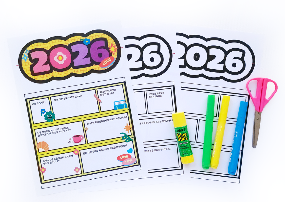 새해가 되면 아이들은 자연스럽게 “올해는 어떤 일이 생길까?” 하고 생각하게 됩니다. 2026년을 맞아, 아이와 함께 한 해의 목표와 다짐을 글과 그림으로 표현해 볼 수 있는 미술활동 도안을 준비했어요. 숫자 ‘2026’을 위아래로 펼치면 아이의 생각과 계획이 담긴 이야기가 나타나는 구조로, 표현 활동과 자기 성찰을 함께 경험할 수 있는 활동입니다. 지금부터 차근차근 살펴볼게요.