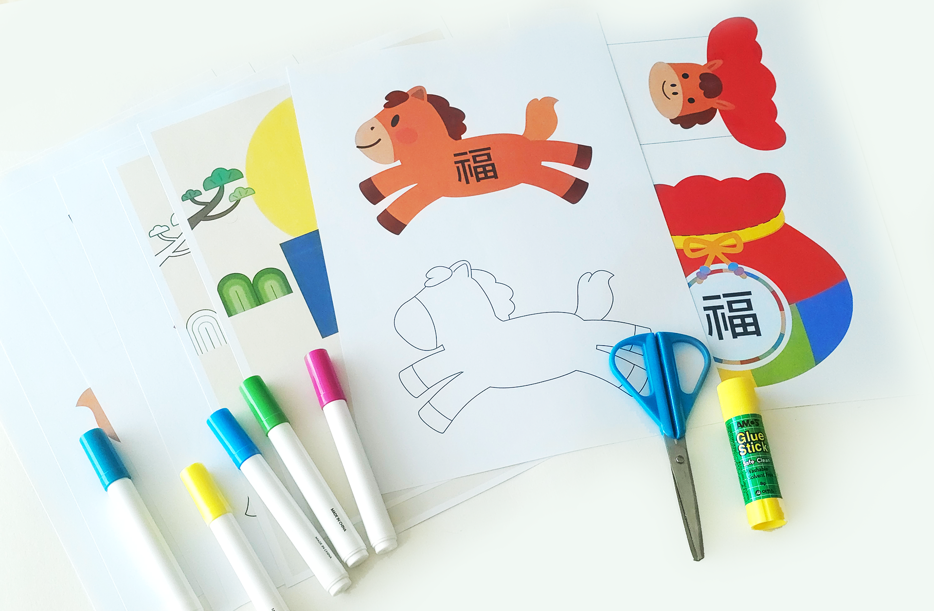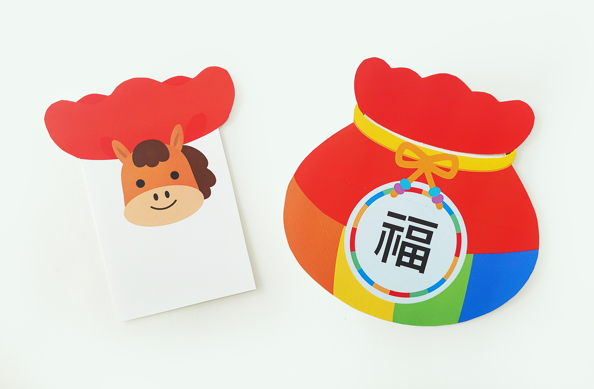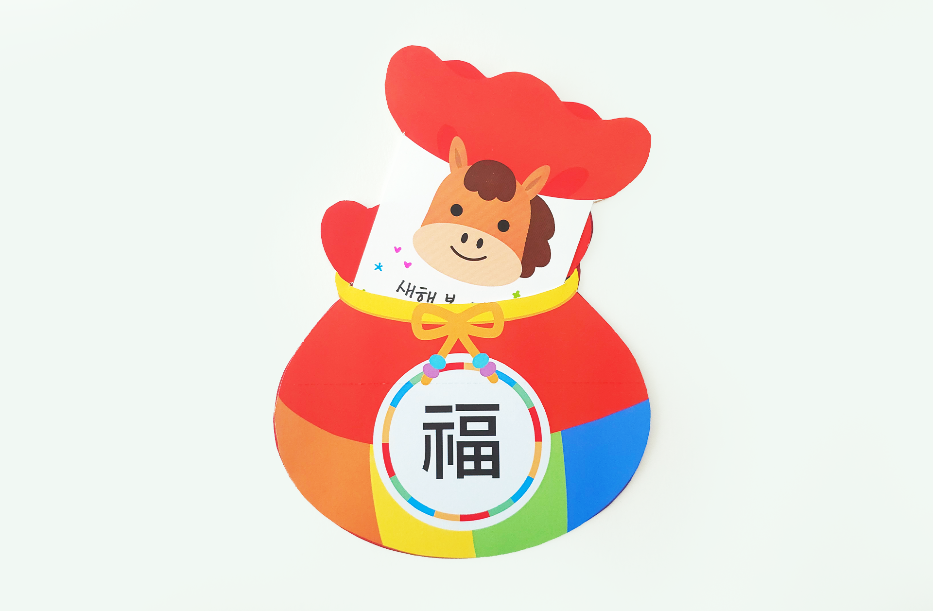 · 색도화지 가장자리에 풀을 바른 뒤 복주머니 도안을 붙이고, 점선 사이로 말 메시지 카드를 쏙 넣어 완성해요.
