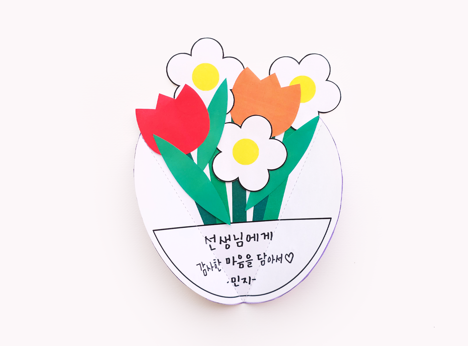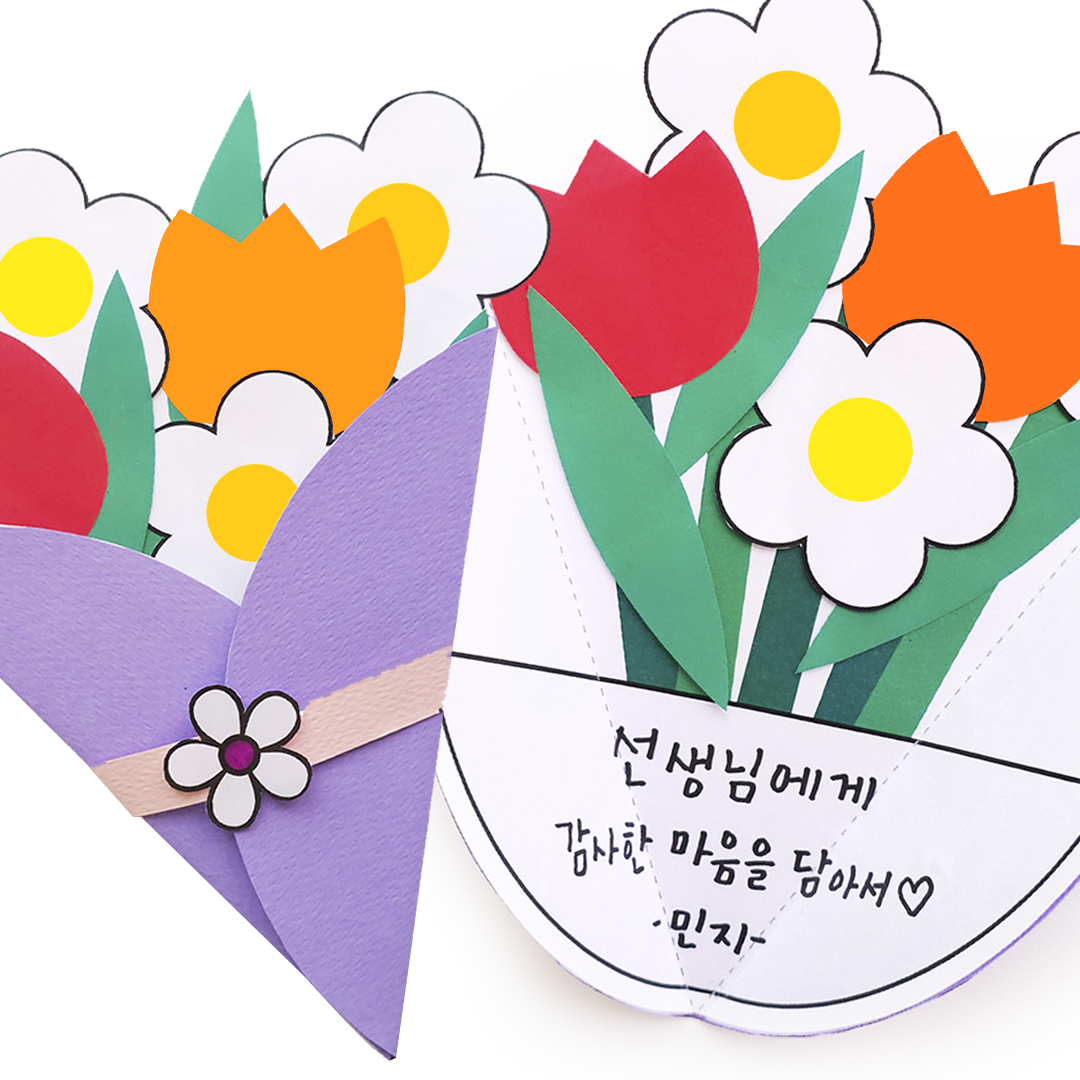 꽃다발을 살짝 열면 안쪽에 편지가 보이는 구조라, 스승의날 감사 편지, 어버이날 사랑 편지, 설날 새해 인사 편지지 만들기로 모두 활용할 수 있어요.