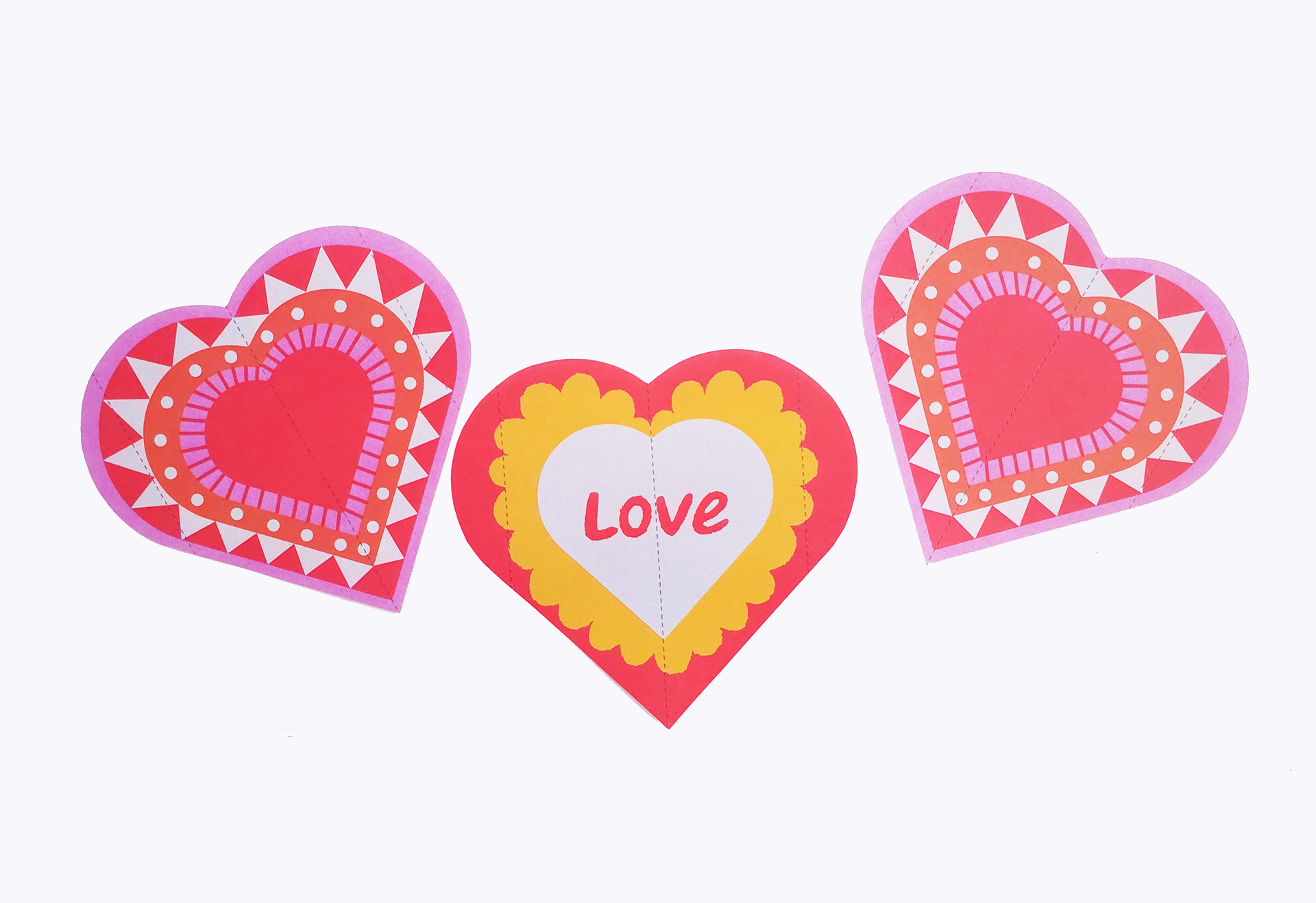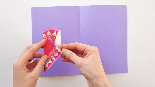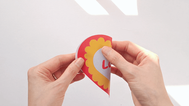 색칠을 마친 뒤에는 하트의 바깥선을 따라 오려요. 도안 안에 표시된 세로 점선을 기준으로 하트를 반으로 접고, 양옆 점선을 따라 한 번 더 접어 주세요. 접는 방향에 따라 카드가 어떻게 펼쳐질지 자연스럽게 예상해 보는 과정이 흥미로운 배움이 된답니다.