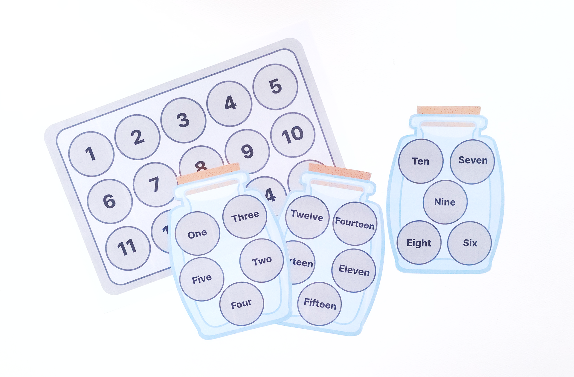 오븐에 넣는 판에는 숫자가 적혀있고 유리병에는 1~15의 숫자가 영어로 적혀있어요.
