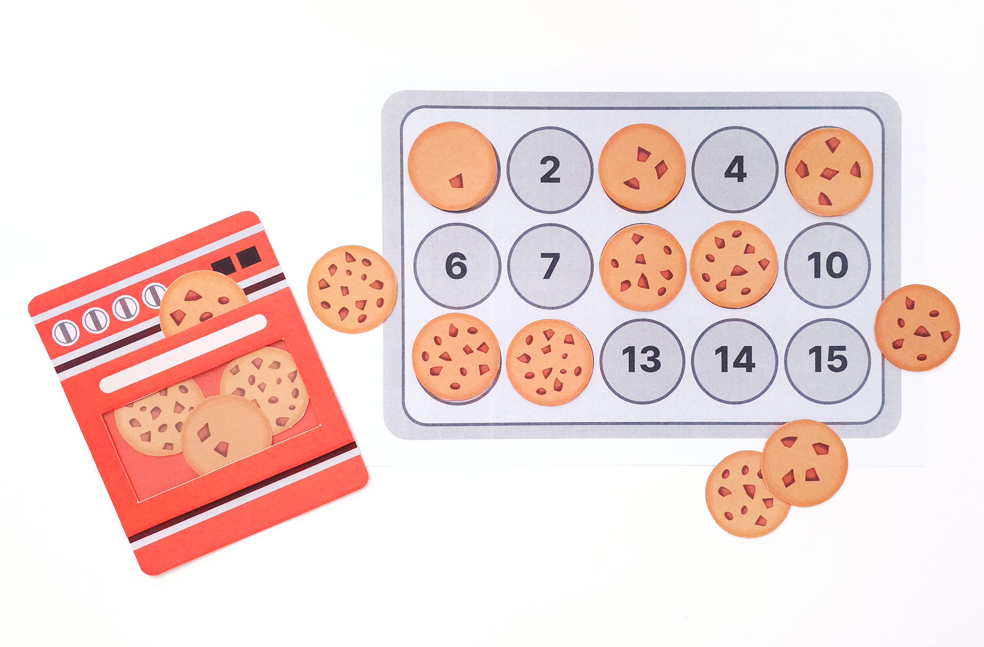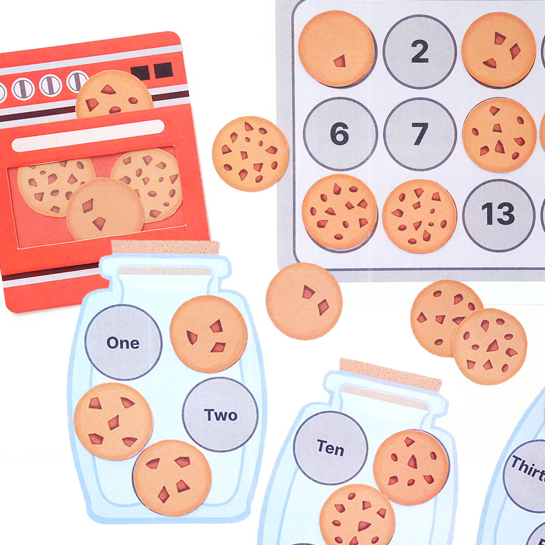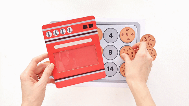 숫자에 맞춰서 쿠키를 올려놓고 맞추면 오븐 안에 쿠키를 넣어요. 오븐에 쿠키를 넣고 굽는 과정을 연출하면서 자연스럽게 역할놀이로 확장할 수 있어요. 놀이가 더 풍부해지고 언어 표현도 함께 자랍니다. 초코칩 하나를 짚을 때마다 하나씩 세어 보는 과정에서 일대일 대응 능력이 자연스럽게 길러져요.