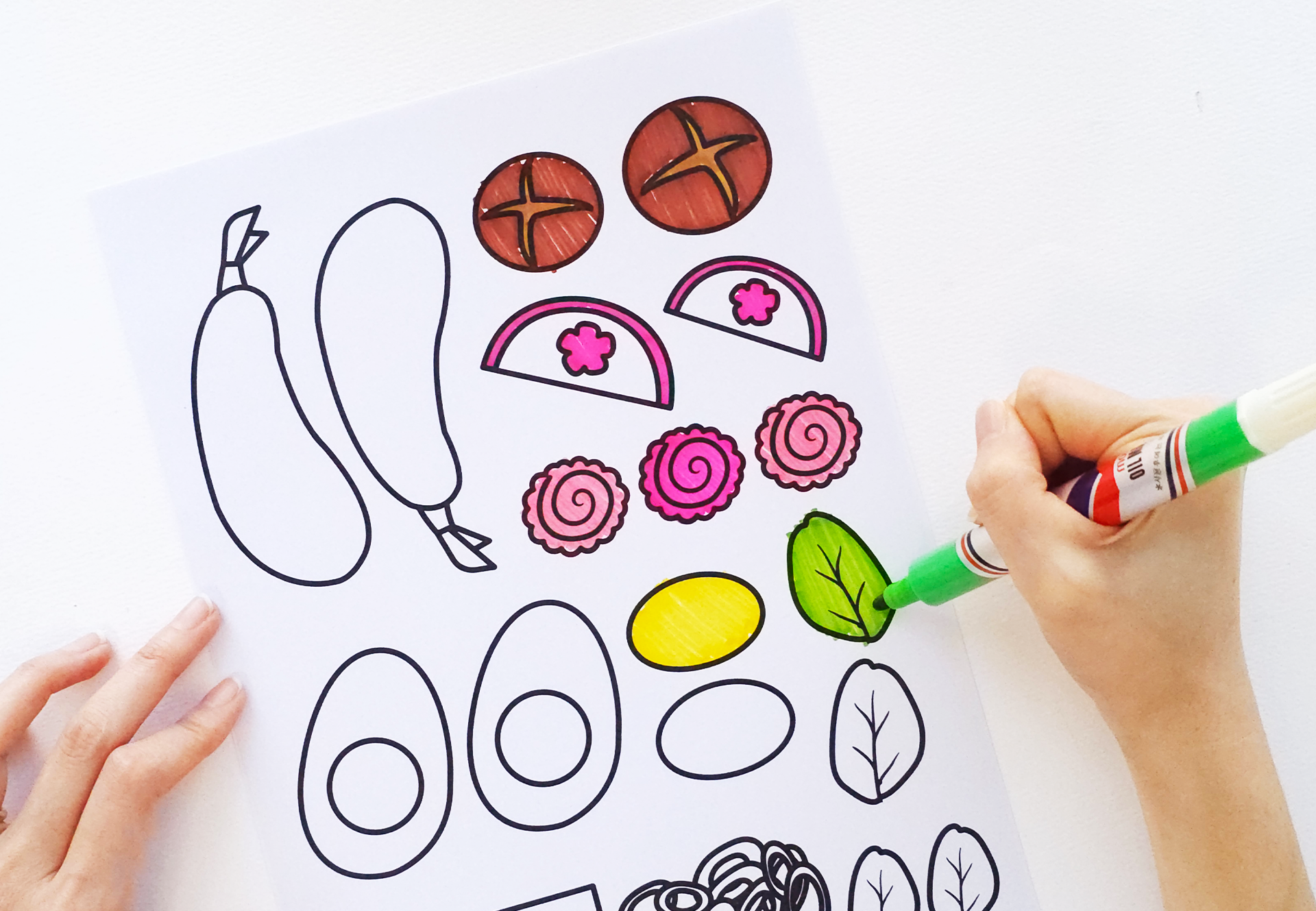 도안은 총 4장으로 구성되어 있으며, 라면과 우동 그릇은 컬러 버전과 색칠 버전이 함께 제공됩니다. 고명 도안 역시 색이 있는 버전과 직접 색칠할 수 있는 버전이 포함되어 있어 연령과 수업 목적에 맞게 선택해 사용할 수 있습니다.