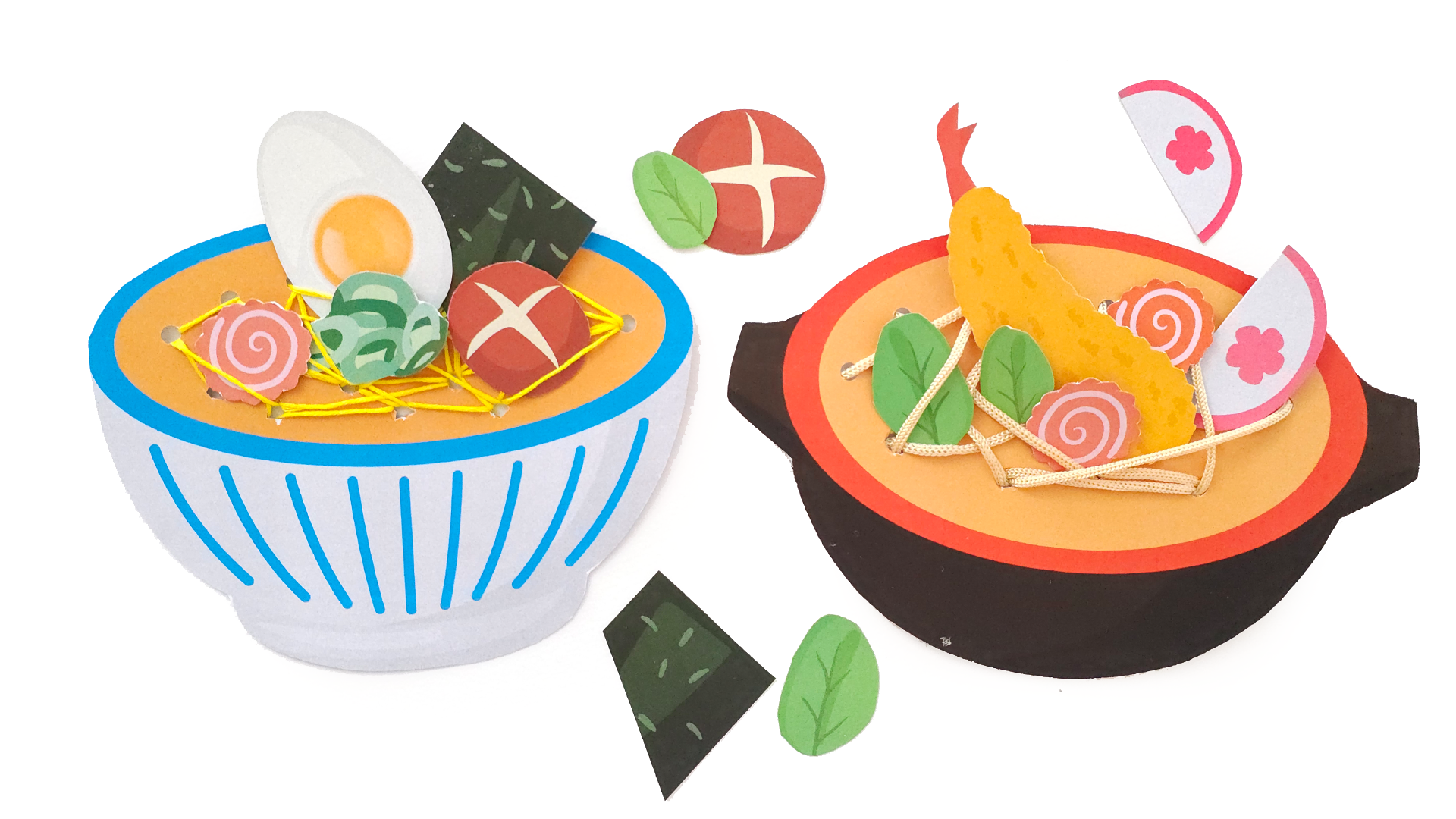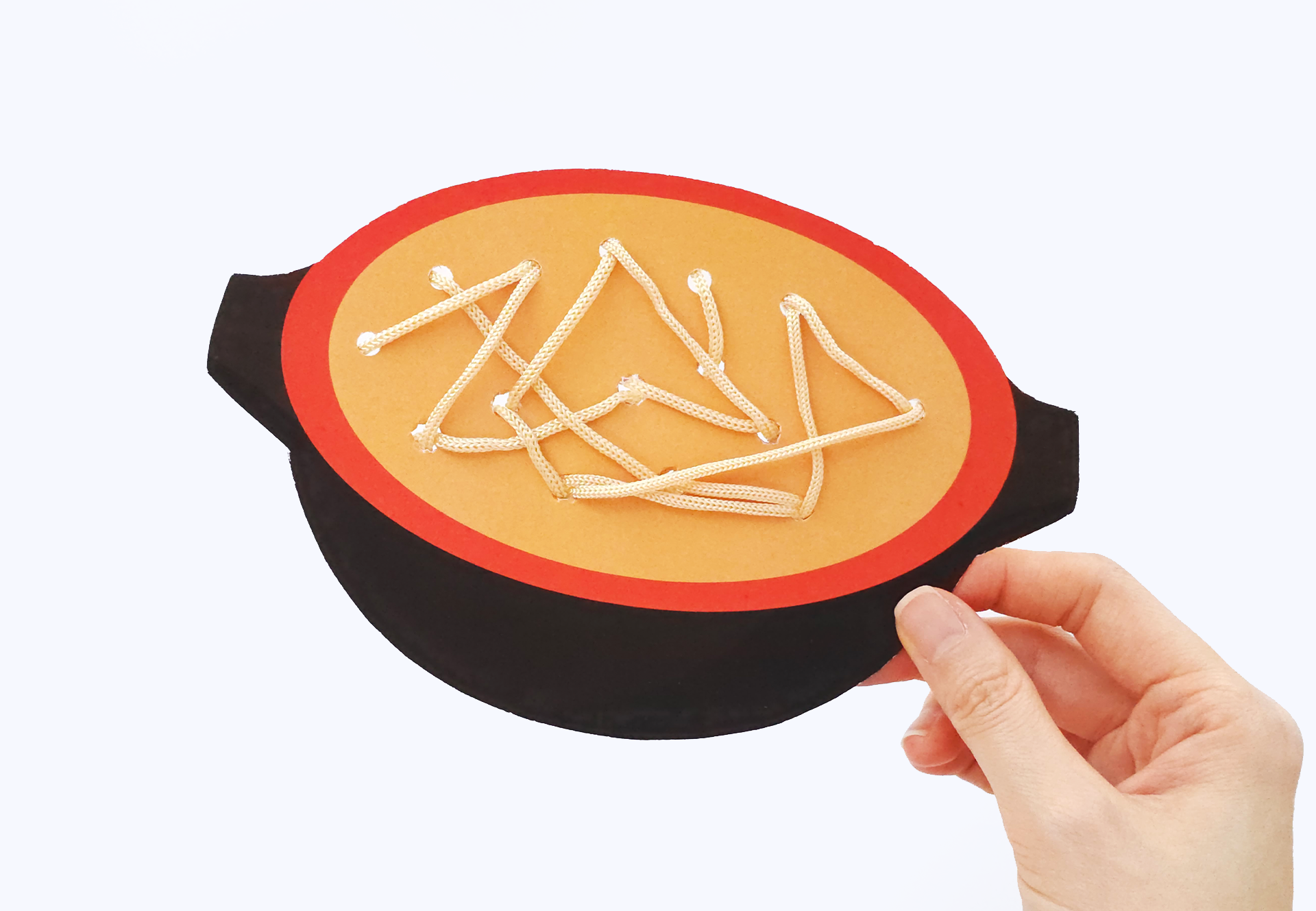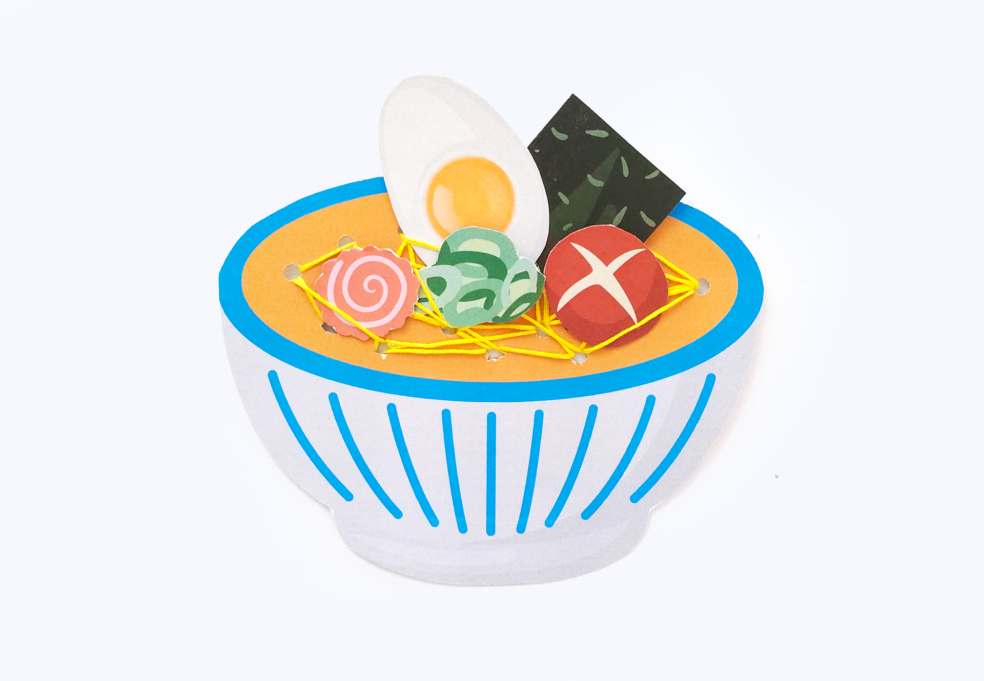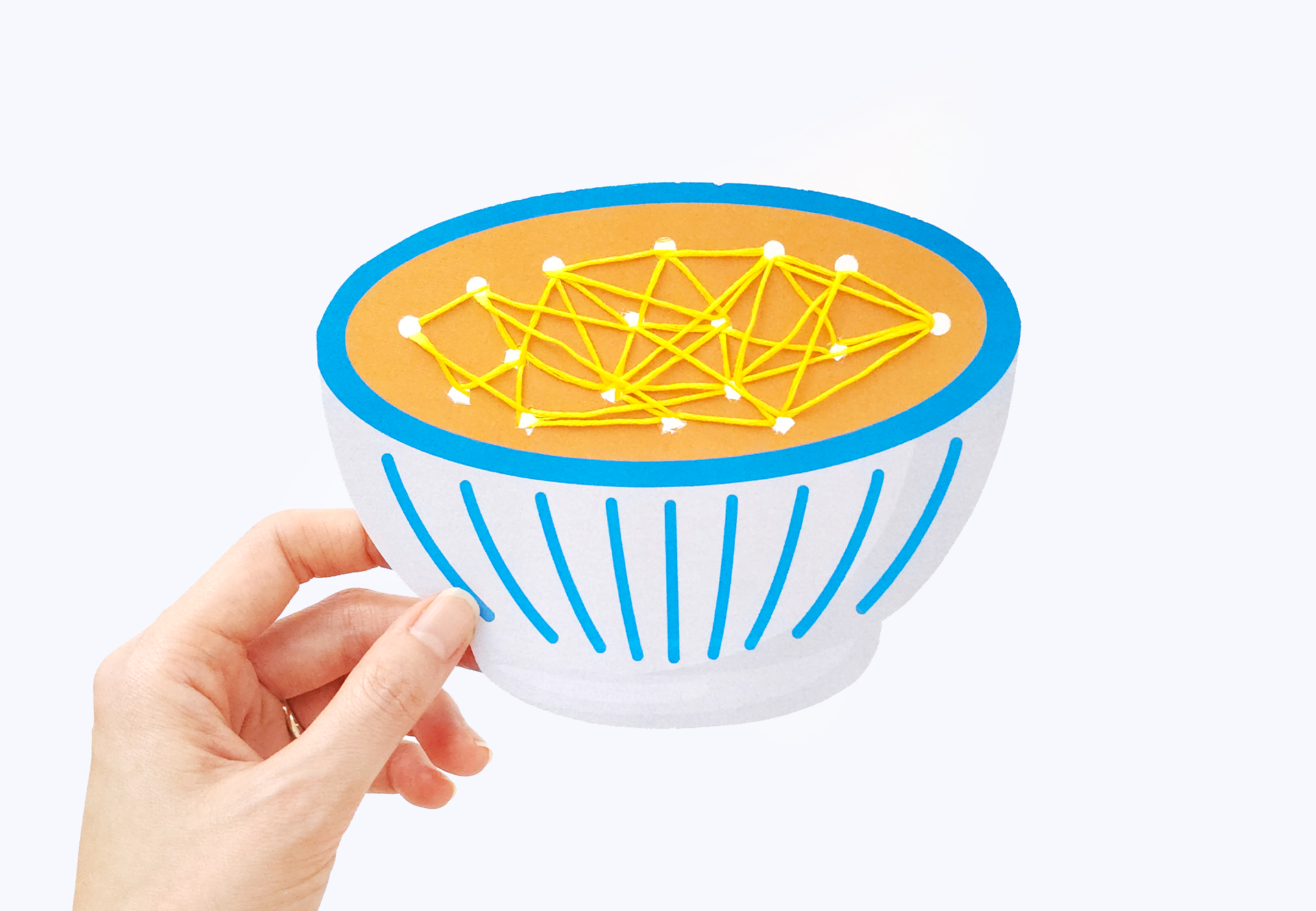 먼저 원하는 그릇 도안을 두꺼운 도화지에 붙인 뒤 외곽선을 따라 오립니다. 면이 들어갈 부분에 구멍펀치로 여러 개의 구멍을 뚫어 준비한 다음, 실이나 털실을 이용해 구멍 사이를 오가며 면을 표현합니다. 마지막으로 고명을 색칠해 붙이면 입체감 있는 라면 또는 우동 그릇이 완성됩니다.