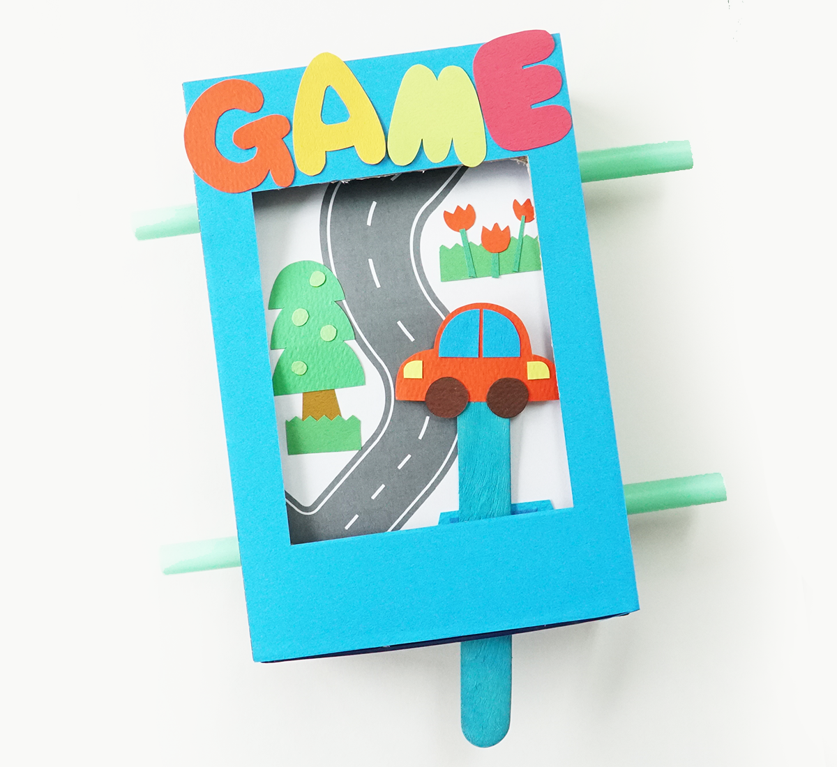 직사각형에 아이스크림 스틱을 넣고 도로 위에 차가 서있도록 자리 잡아주세요.